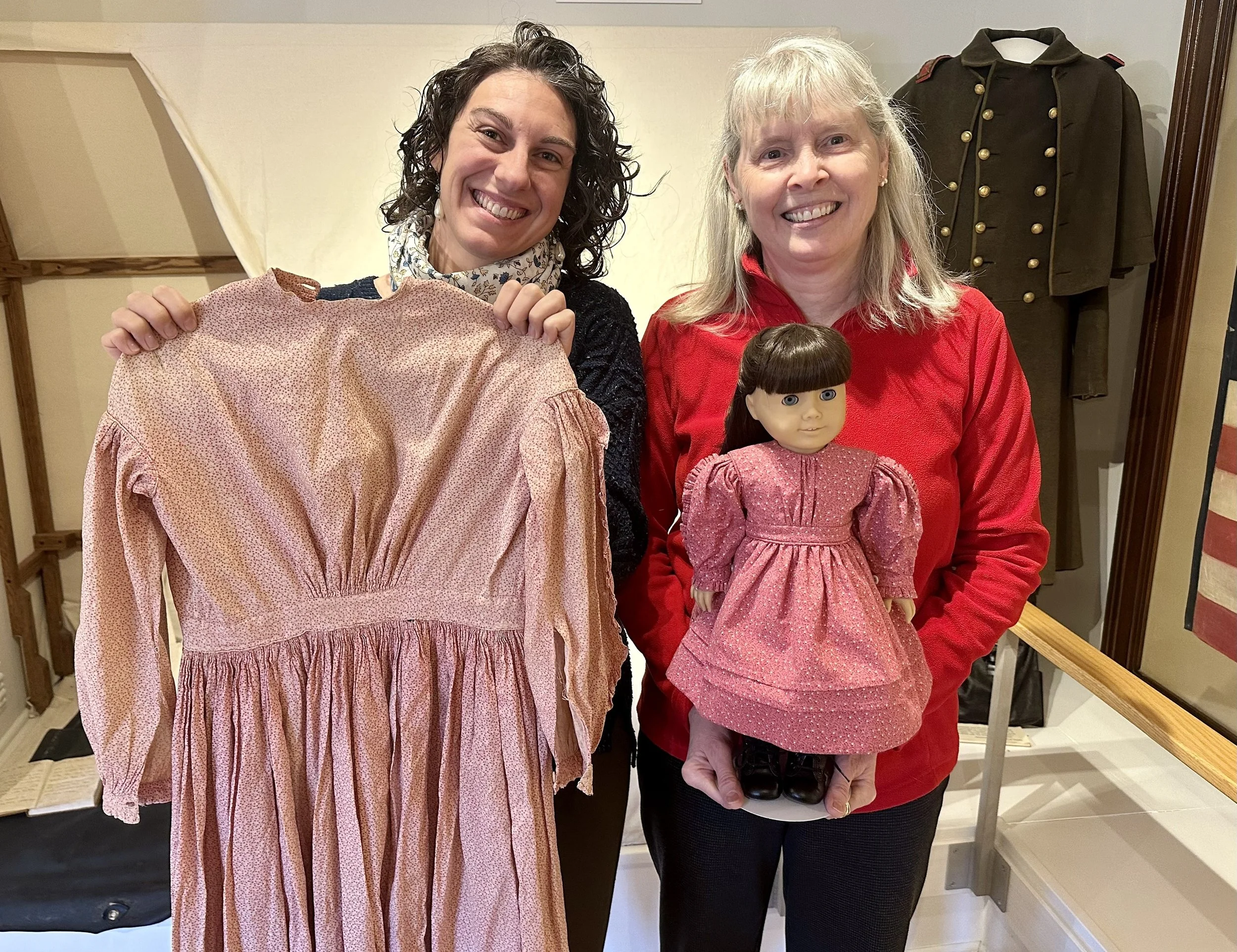 Hannah Harvey of the Manitowoc County Historical Society, left, holds the 19th-century girls’ dress that inspired Lisa Alfsen of Newton to make a doll-sized replica.